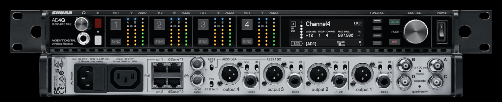 Четырёхканальный приёмник AD4Q - это новый стандарт спектральной эффективности. Революционные характеристики включают в себя широкий диапазон настройки, низкую задержку, режим высокой плотности каналов (HD) и новый режим Quadversity, обеспечивая надёжную работу в самых трудных РЧ-условиях. Сетевое управление, выходы AES3 + AES67 + Dante и различные опции маршрутизации сигналов предоставляют новый уровень менежджмента и гибкости вашего рабочего процесса.